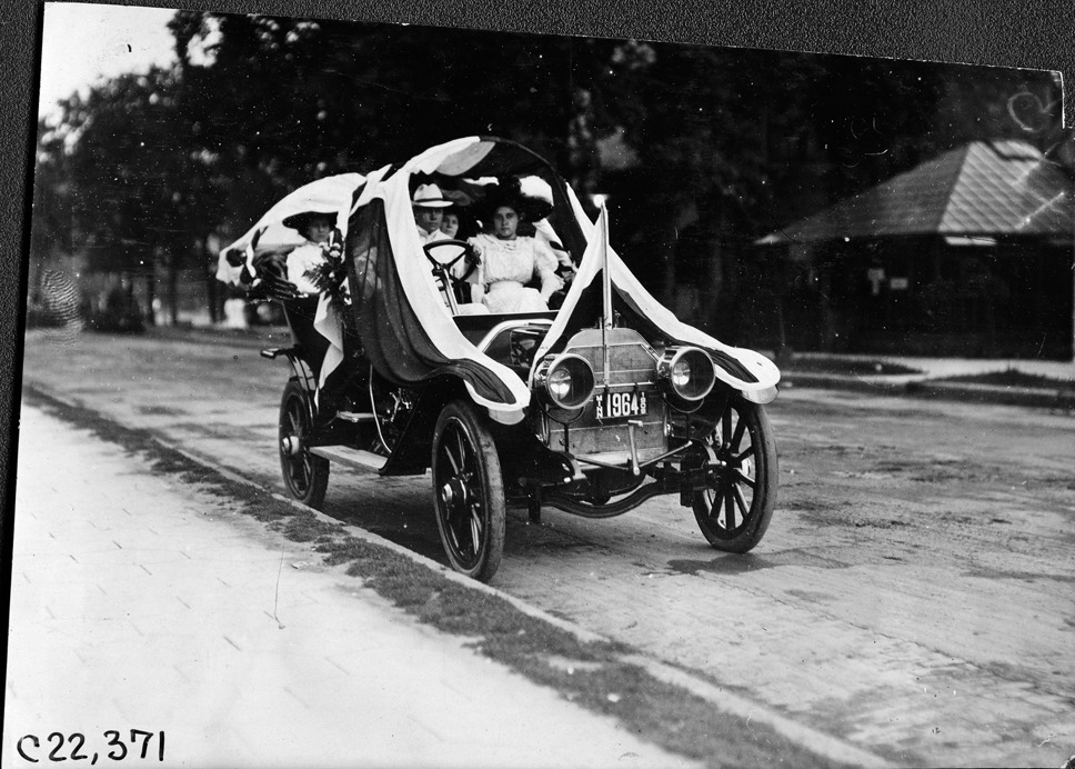 Mr. Haliday in decorated Winton for parade in Minnesota, at the 1909 Glidden Tour