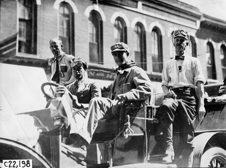 View of Studebaker press car with four men in the vehicle, in Minneapolis, Minnesota, at the 1909 Glidden Tour. Photo edges cut unevenly. Stamped on back: "Photo by Spooner & Wells, Inc. 1931 Broadway, N.Y."
