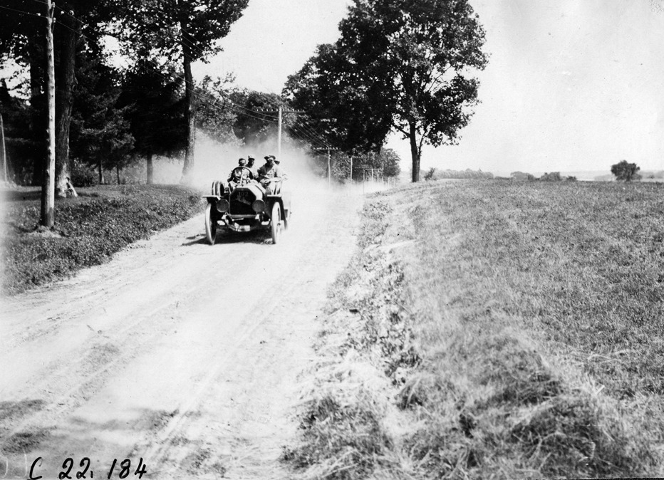 View of Sylvester Gregory and three passengers in Moline #102 on rural road near Madison Lake, Minnesota, at the 1909 Glidden Tour. Photo edges cut unevenly. Stamped on back: "Spooner & Wells, Inc., photographers, telephones 3472-3473 Columbus, 1931 Broadway, New York."
