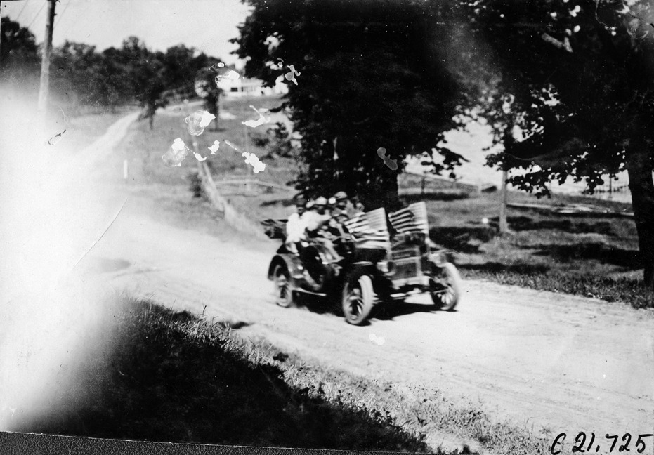 View of Illingsworth and three passengers in car #112, American flags flying on front, on rural road with lake visible on right, near Mankato, Minnesota, at the 1909 Glidden Tour. Small, white blotches on photo near center. Photo edges cut unevenly. Stamped on back: "Spooner & Wells, Inc., photographers, telephones 3472-3473 Columbus, 1931 Broadway, New York."