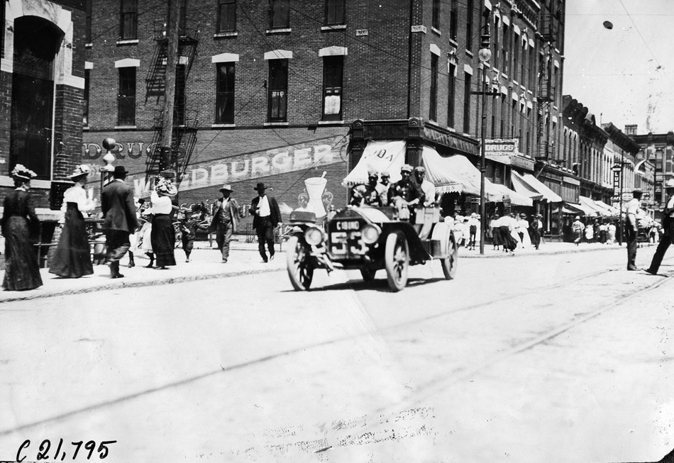 Car #53 on downtown street, 1909 Glidden Tour