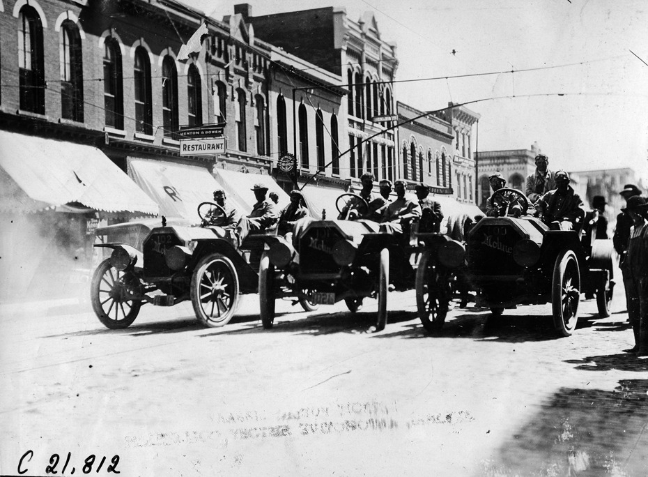 View of Moline cars # 100, 101 and 102 with drivers and passengers, abreast on commercial street, people looking on, in Mankato, Minnesota, at the 1909 Glidden Tour. Photo edges cut unevenly. Stamped on back: "Photo by Spooner & Wells, Inc. 1931 Broadway, N.Y."