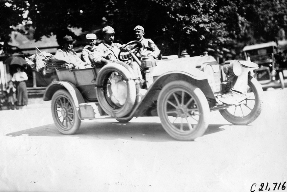 View of Marmon car #4 driven by Frank Wing with three passengers at Mankato, Minnesota, at the 1909 Glidden Tour. Photo edges cut unevenly. Stamped on back: "Photo by Spooner & Wells, Inc. 1931 Broadway, N.Y."