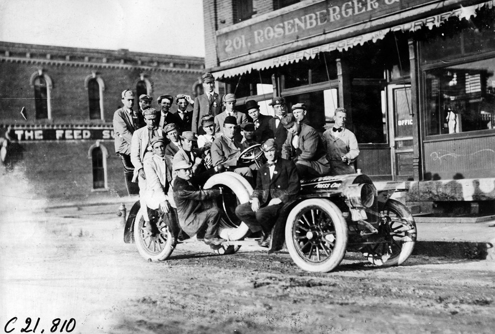 View of men posing with press car in front of Rosenberger & Co. store in Algona, Iowa, at the 1909 Glidden Tour. Photo edges cut unevenly. Stamped on back: "Photo by Spooner & Wells, Inc. 1931 Broadway, N.Y."