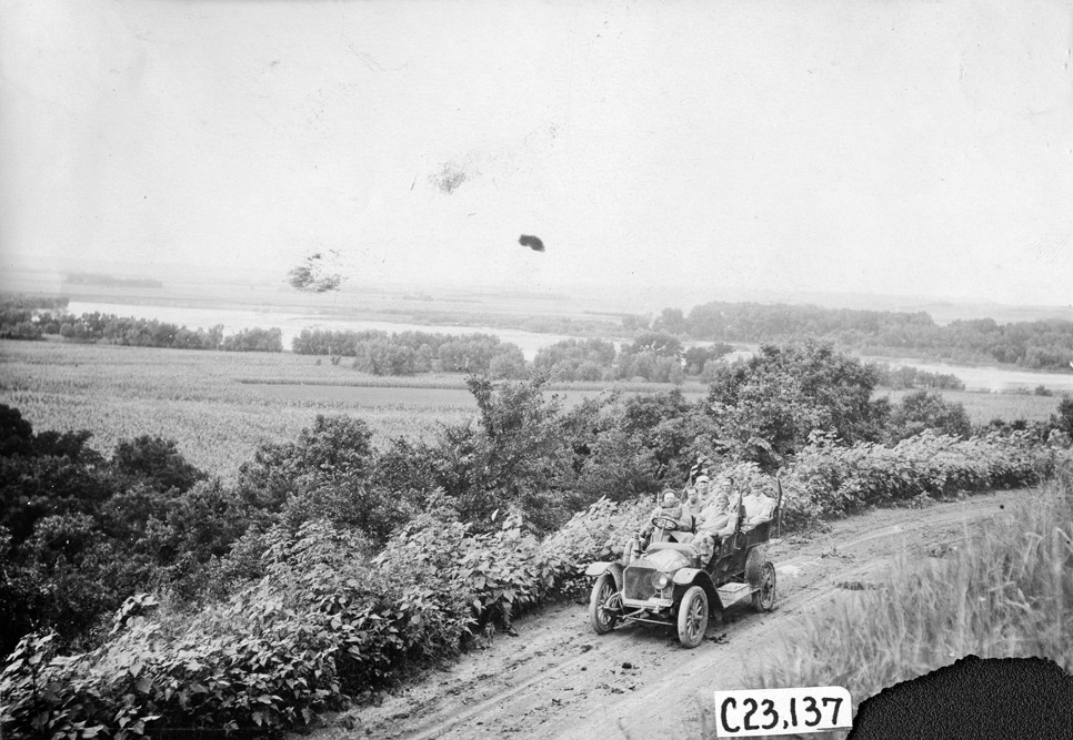 Favorite this☆ Participants in Iowa countryside, at the 1909 Glidden Tour Description: View of participants on a dirt road in Iowa, possibly a river in the background, at the 1909 Glidden Tour. Lower right corner of picture is missing. Photo edges cut unevenly. Details Resource ID: EB01f906 Subject: Glidden Tour (1909) Automobiles--Iowa Rural roads--Iowa Automobile driving--Competitions--United States Photographic prints Date Issued: 1909-07 Format: 1 photographic print ; 4.5 x 6.5 in. Member of: National Automotive History Collection Lazarnick Collection Filing Location: Tours--Glidden Tour, 1909 Negative Number: Negative #C23,137 Rights: Physical rights are retained by DPL. Copyright is retained in accordance with U.S. copyright laws.