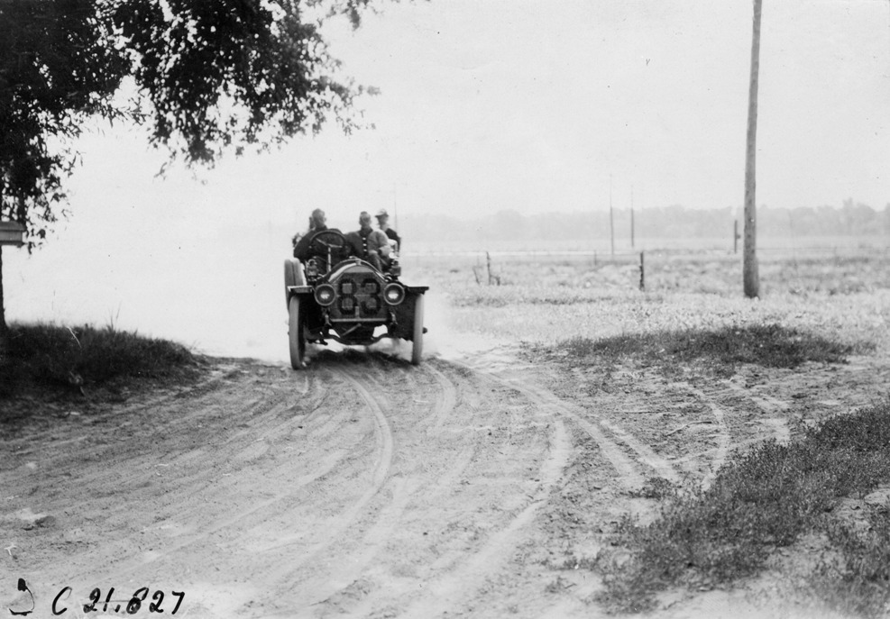 Henry Bill in Chalmers car rounding a turn near Wood River, Nebraska, at 1909 Glidden Tour