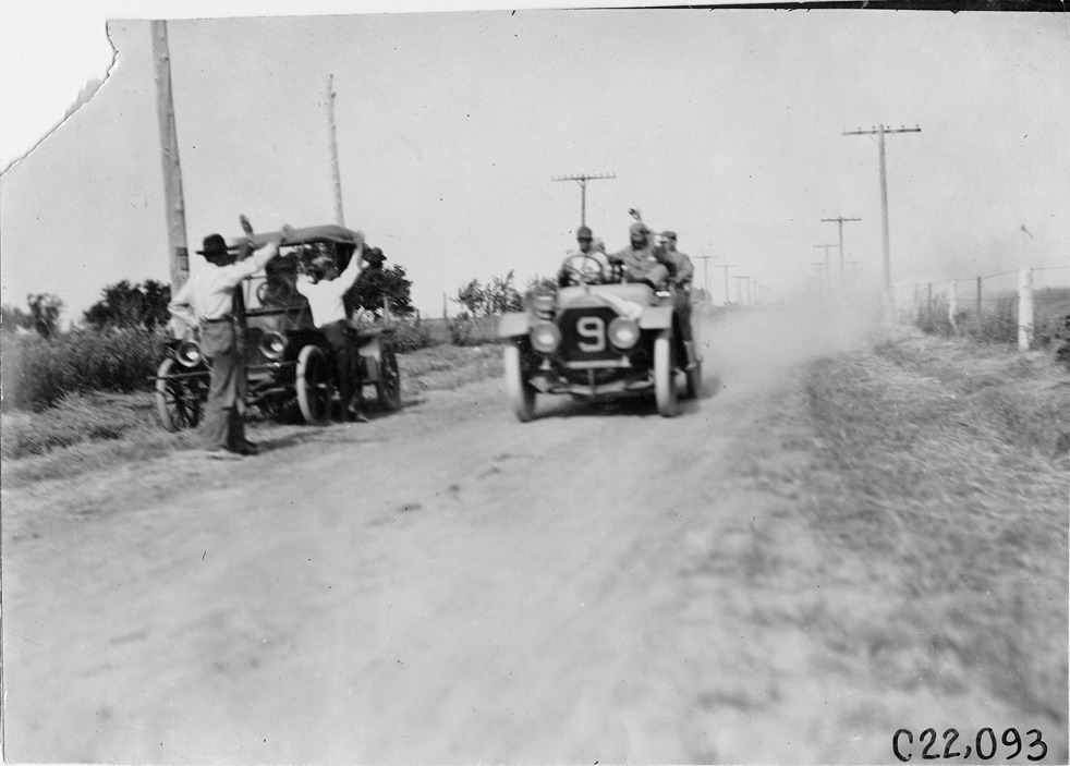 W. Winchester in Pierce car on rural road near Kearney, Nebraska, at 1909 Glidden Tour