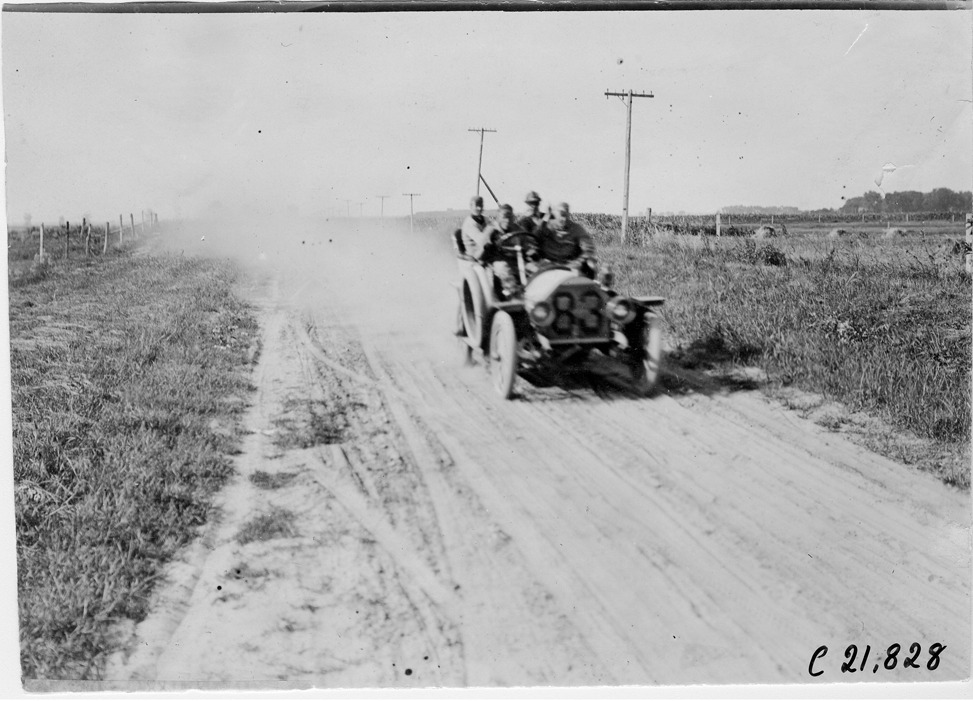 View of Harry Bill, Harry Ford and two passengers in Chalmers #83 on rural road near Kearney, Nebraska, at the 1909 Glidden Tour. Photo edges cut unevenly. Stamped on back: "Photo by Spooner & Wells, Inc. 1931 Broadway, N.Y."