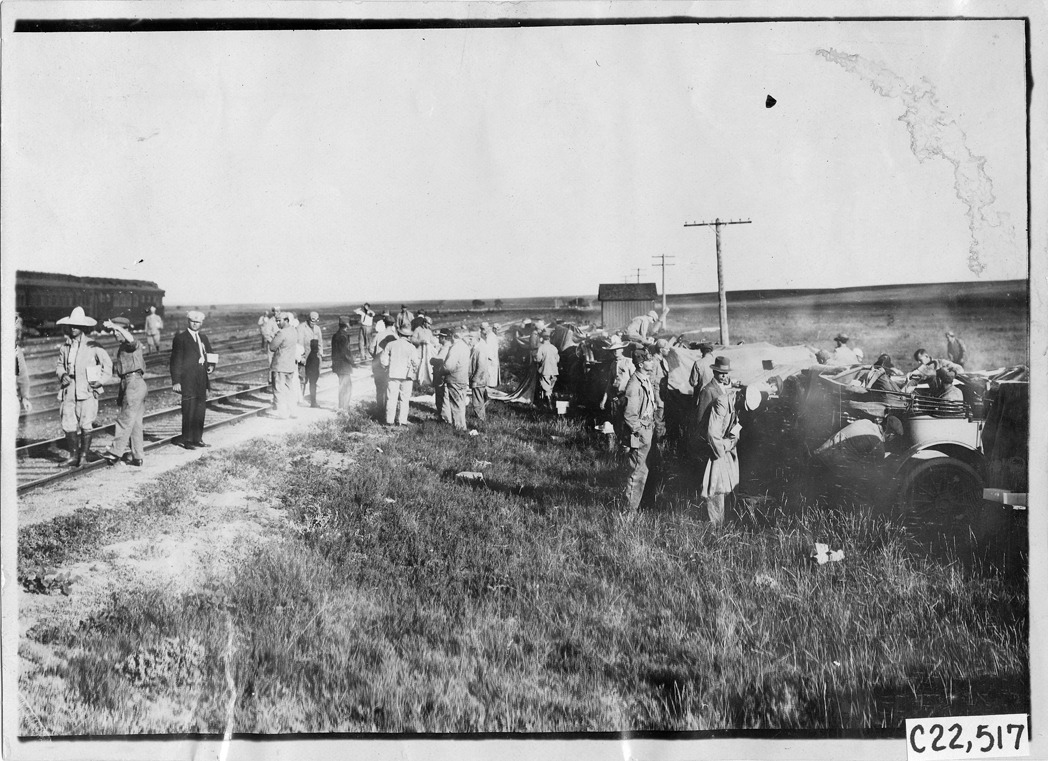 View of tourists preparing to leave the railroad station in Kearney, Nebraska, at the 1909 Glidden Tour.