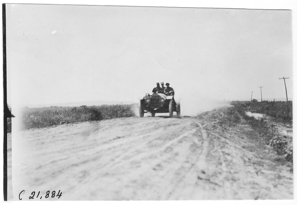 View of Pierce #108 driven by John S. Williams and two passengers, on a dirt road near North Platte, Nebraska, at the 1909 Glidden Tour. Photo edges cut unevenly. Stamped on back: "Photo by Spooner & Wells, Inc. 1931 Broadway, N.Y."