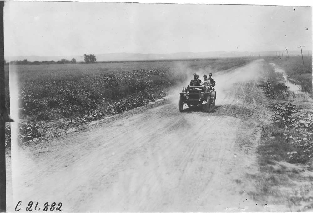 View of Maxwell car #6, driver and three passengers on a dirt road, nearing North Platte, Nebraska, at the 1909 Glidden Tour. Photo edges cut unevenly. Stamped on back: "Photo by Spooner & Wells, Inc. 1931 Broadway, N.Y."