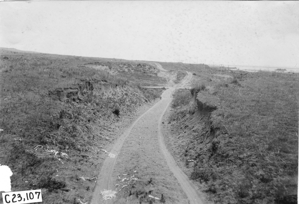 View showing road in an arroyo and surrounding view, at the 1909 Glidden Tour. Lower left corner of picture is missing. Stamped on back: "Photo by N. Lazarnick, 29 West 42nd Street, N.Y., tel. 594 Bryant."