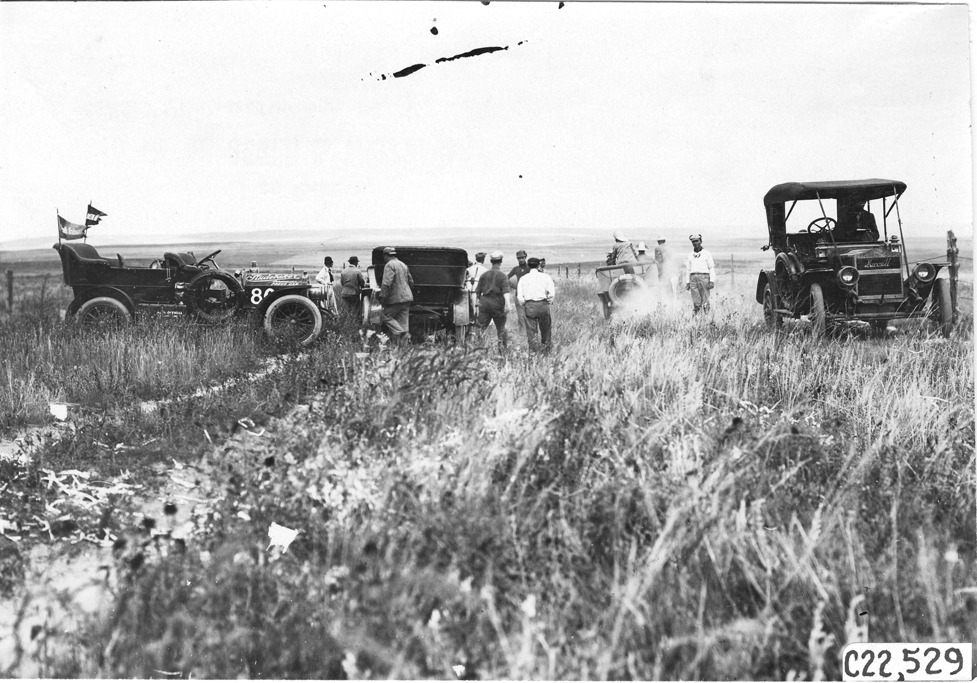 View of Studebaker press car and other vehicles stopped on the Colorado prairie, at the 1909 Glidden Tour. Caption on photo back: "Press men where the Simplex went into a hole on the Colorado prairie." Photo edges cut unevenly. Stamped on back: "Photo by Spooner & Wells, Inc. 1931 Broadway, N.Y."