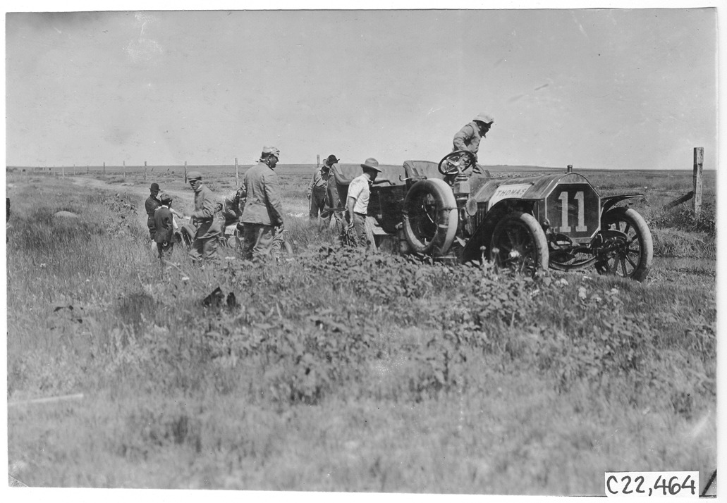 View of Thomas #11 crossing a large ditch, near Aurora, Colorado, at the 1909 Glidden Tour. Photo edges cut unevenly.