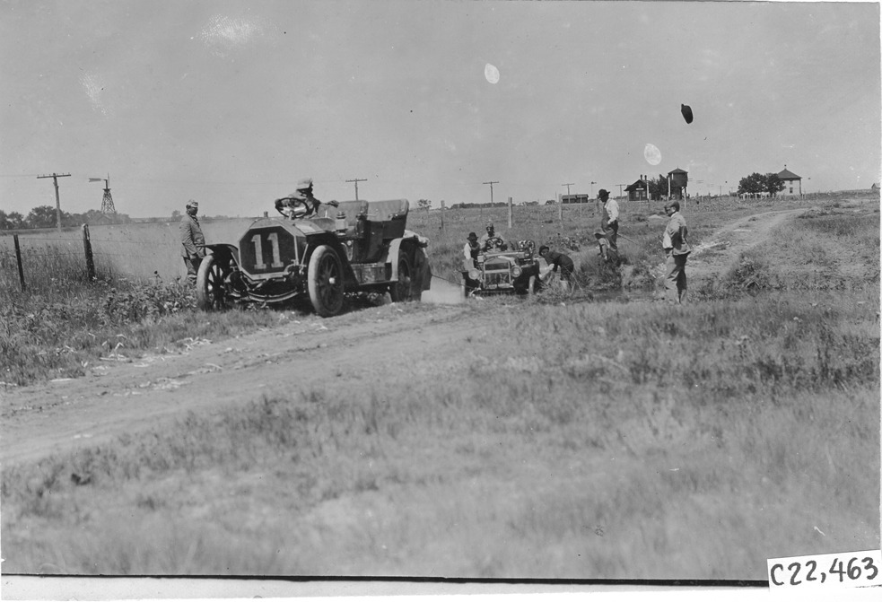 View of Thomas #11 coming to the aid of Maxwell #107 stuck in a large ditch, near Aurora, Colorado, at the 1909 Glidden Tour. Photo edges cut unevenly.