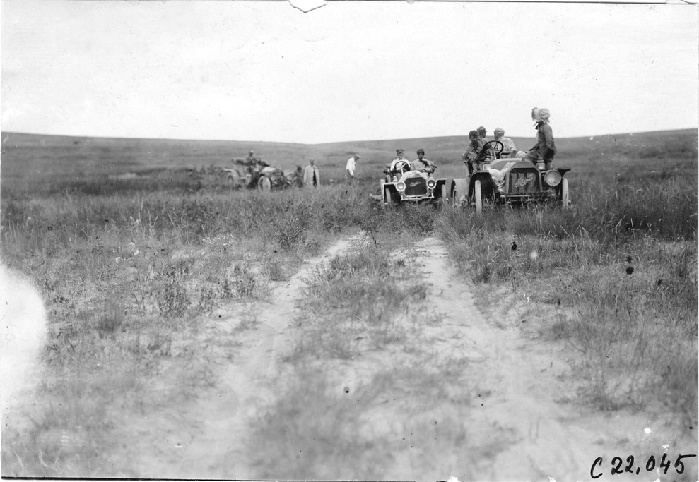 View of participants crossing through a farm yard, the Chalmers car is on the path, the Mason car is off to the side, a woman wearing a bonnet sitting on the front fender of the vehicle, a car in the rear of the group with its passengers outside of the vehicle, at the 1909 Glidden Tour.