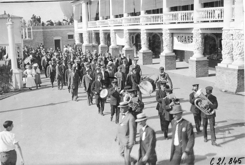 Glidden tourists, led by marching band in Lakeside Park, Denver, Colorado, at 1909 Glidden Tour