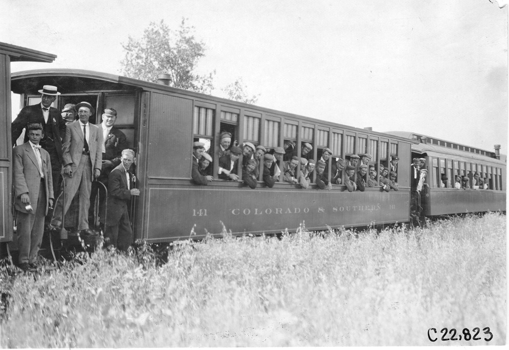 Glidden tourists look out from railroad cars headed for Mt. McClellan, Colorado, at 1909 Glidden Tour