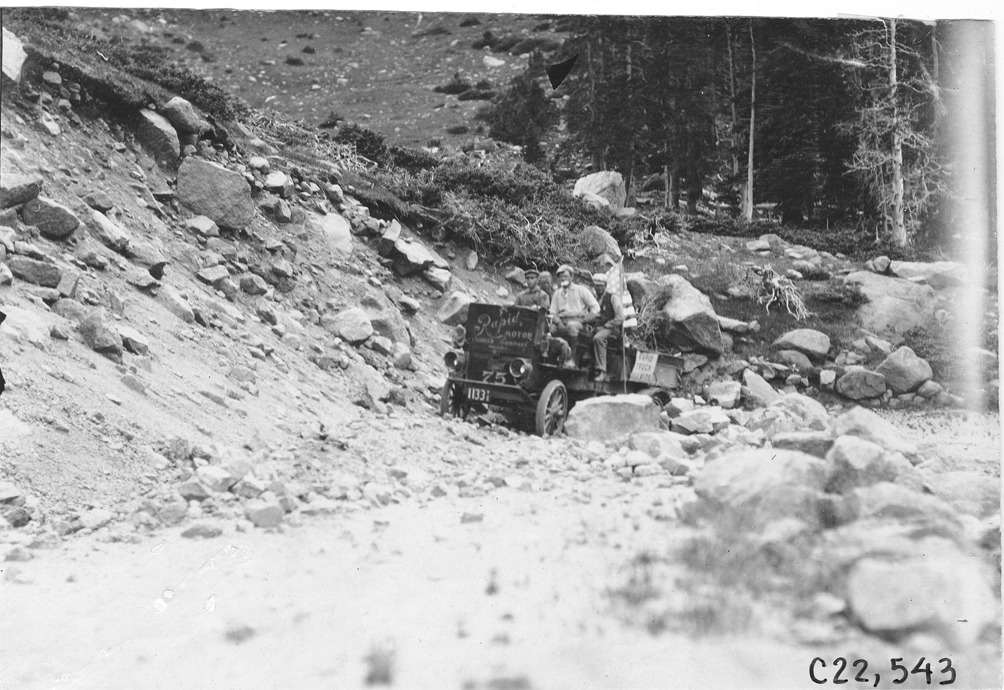 Rapid motor truck on rock covered mountain road in Colorado, at 1909 Glidden Tour