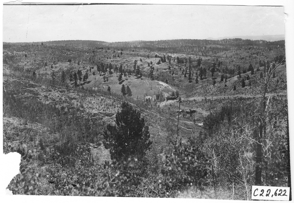 View of a mountain view in Colorado, at the 1909 Glidden Tour. Lower left corner of photo is missing. Photo edges cut unevenly.