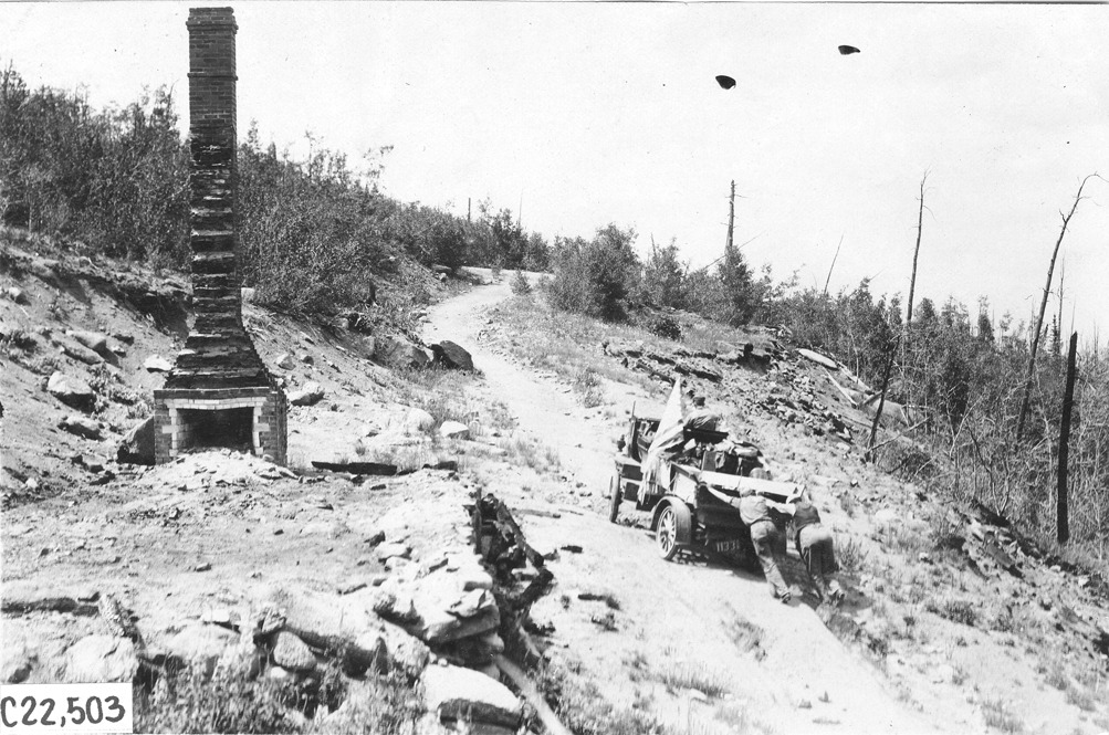 View of two men pushing Rapid motor truck up a steep mountain road near Pikes Peak, Colorado, past the Halfway House ruins, during the 1909 Glidden Tour. Brick chimney and fireplace on left.