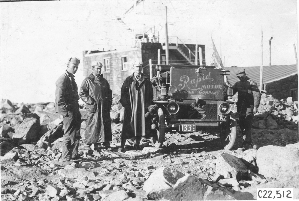 Favorite this☆ Rapid motor truck at Pikes Peak observation tower, 1909 Glidden Tour Description: View of driver and three passengers posing next to Rapid truck in front of observation tower near Pikes Peak, Colorado during the 1909 Glidden Tour. Details Resource ID: EB01g333 Subject: Glidden Tour (1909) Watchtowers--Colorado--Pikes Peak Trucks--Colorado--Pikes Peak Rapid Motor Vehicle Company Automobile driving--Competitions--United States Photographic prints Date Issued: 1909-07 Format: 1 photographic print ; 4.5 x 6.5 in. Member of: National Automotive History Collection Lazarnick Collection Filing Location: Tours--Glidden Tour, 1909 Negative Number: Negative #C22,512 Rights: Physical rights are retained by DPL. Copyright is retained in accordance with U.S. copyright laws.