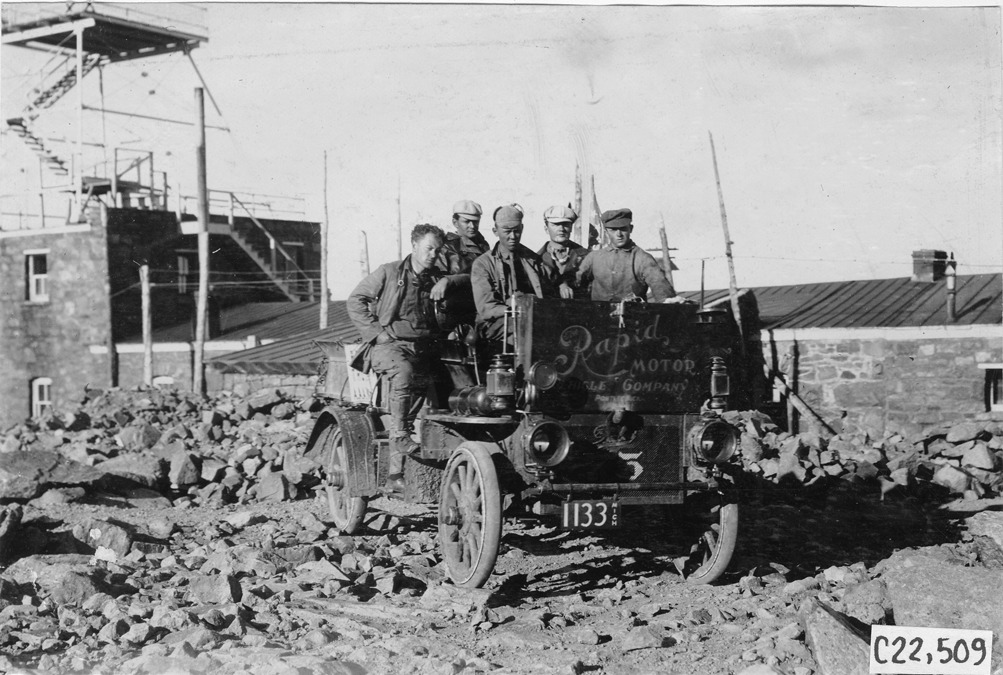 View of Rapid motor truck with driver and four passengers posed on top of mountain in Colorado, building with watchtower in background, at the 1909 Glidden Tour. Photo edges cut unevenly.