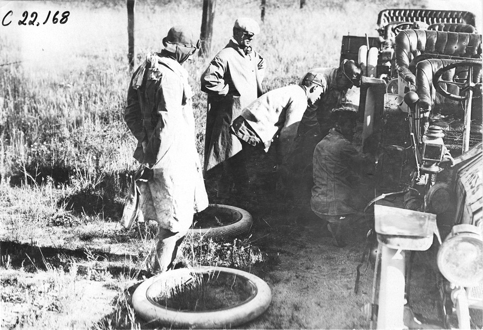 Tire trouble for Studebaker press car in Colorado, at 1909 Glidden Tour