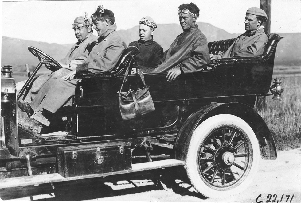 Favorite this☆ Harry McIntosh and crew pose in Studebaker press car on rural road in Colorado, at 1909 Glidden Tour Description: View of Harry McIntosh and crew posing in Studebaker press car on rural road in Colorado, at the 1909 Glidden Tour. Photo edges cut unevenly. Details Resource ID: EB01g358 Subject: Glidden Tour (1909) Studebaker automobile Automobile driving--Competitions--United States Photographic prints Date Issued: 1909-07 Format: 1 photographic print ; 4.5 x 6.5 in. Member of: National Automotive History Collection Lazarnick Collection Filing Location: Tours--Glidden Tour, 1909 Negative Number: Negative #C22,171 Rights: Physical rights are retained by DPL. Copyright is retained in accordance with U.S. copyright laws.