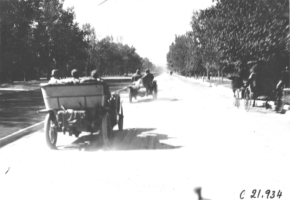 Glidden tourists driving down tree lined street near Colorado Springs, Colorado, at 1909 Glidden Tour