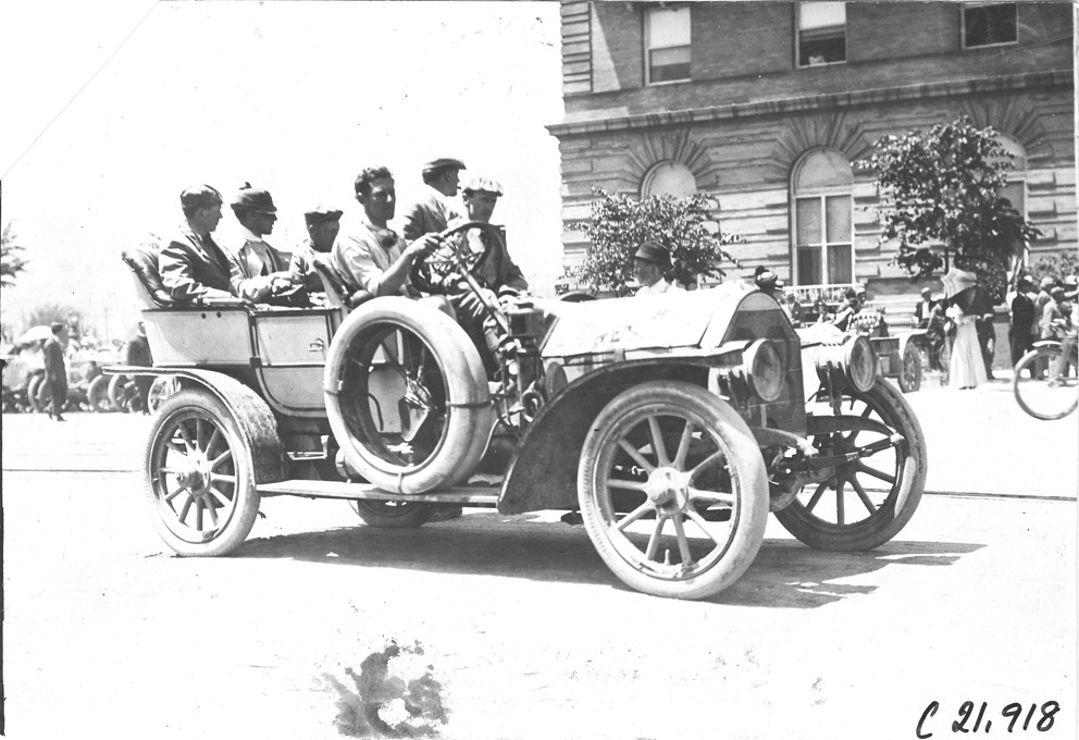 View of Harry Bill and five passengers in Chalmers #83 in front of the Antlers Hotel in Colorado Springs, Colorado, at the 1909 Glidden Tour.