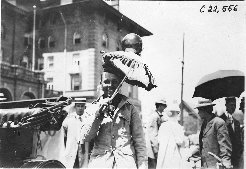 Man with balloon and parasol in Colorado Springs, Colorado, at 1909 Glidden Tour