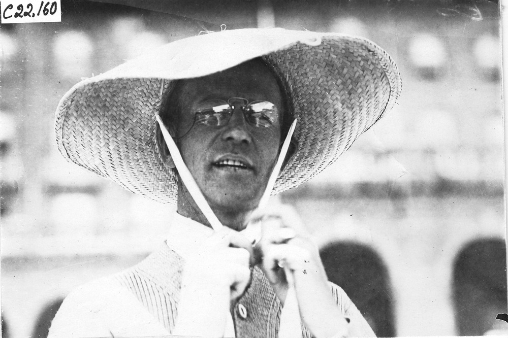 H.L. Smith in sun hat in Colorado Springs, Colorado, at the 1909 Glidden Tour