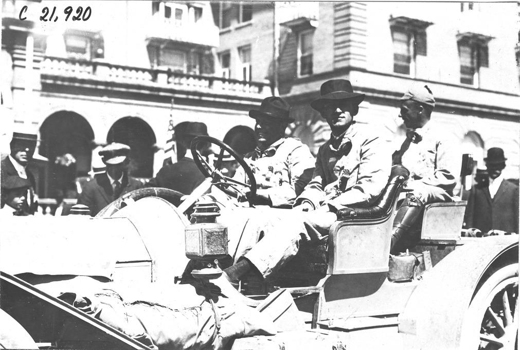 John Williams in Pierce-Arrow car #108 in Colorado Springs, Colorado, at the 1909 Glidden Tour