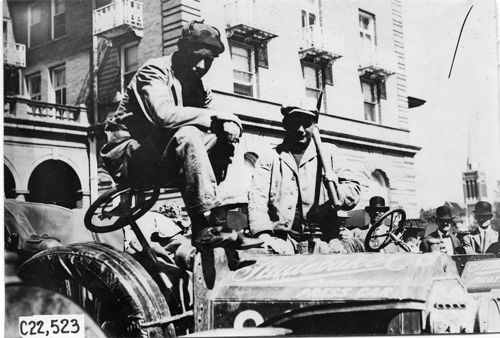View of Studebaker press cars, participant is seated on the steering wheel, while a man is standing on the running board of car holding a pickax over his shoulder, a small crowd of men are in the background looking on, in front of the Antlers Hotel, in Colorado Springs, Colorado, at the 1909 Glidden Tour. Photo edges cut unevenly.