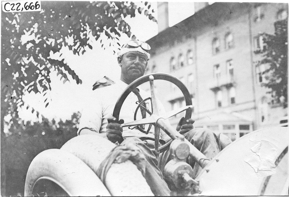 View of driver, hands on steering wheel, wearing hat and goggles and looking straight ahead, in front of the Antlers Hotel in Colorado Springs, Colorado, at the 1909 Glidden Tour. Photo edges cut unevenly.