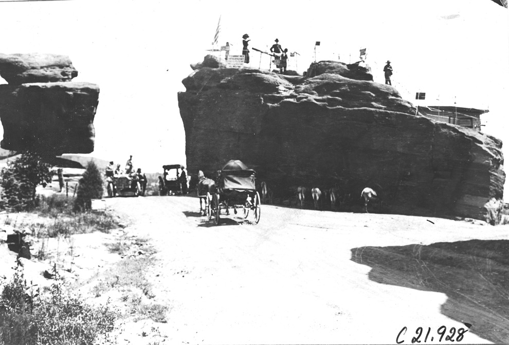 Glidden tourists at Balanced Rock in the Garden of the Gods, Colorado, at the 1909 Glidden Tour