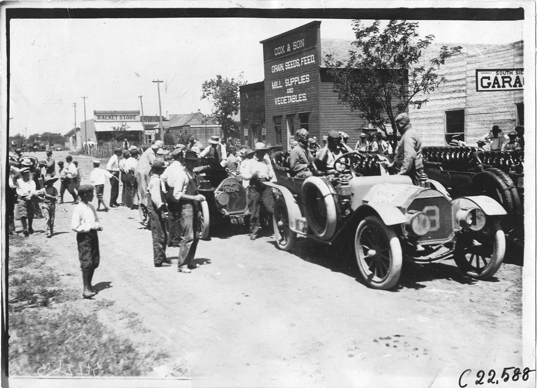 View of Pierce car #8 and Midland car #12 with drivers and passengers, on street in front of South Side Garage and Cox & Son feed store, Racket Store in background, small crowd of men and boys around them, in Hugo, Colorado at the 1909 Glidden Tour.