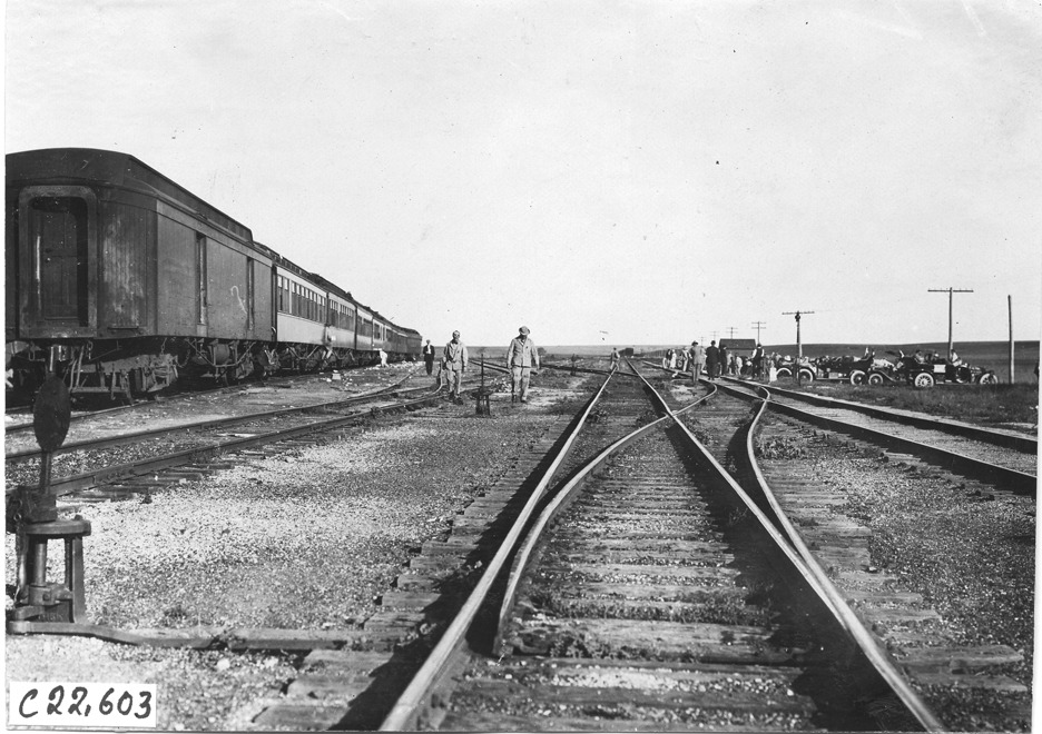 View of railroad tracks, passenger train stopped, several Glidden tourists walking along tracks, cars stopped at crossing, at the 1909 Glidden Tour. Photo edges cut unevenly.