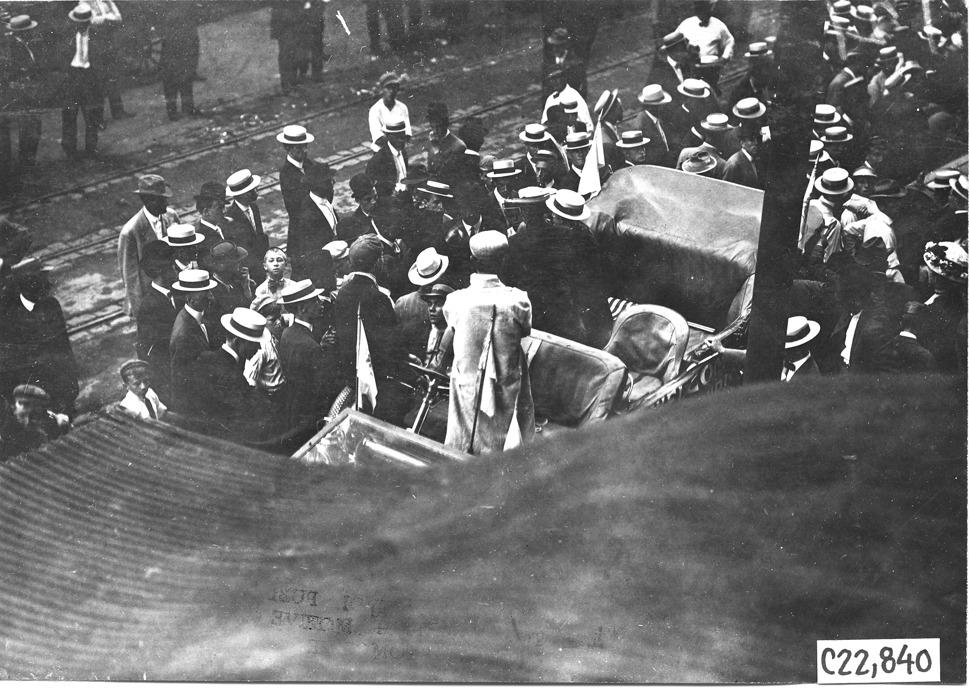 View of large crowd of men surrounding tourist vehicle at Kansas City, Missouri, at the 1909 Glidden Tour. Caption on photo back: "Mayor in the Pierce at Kansas City."