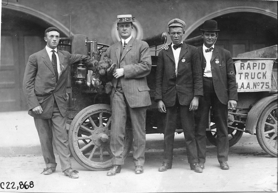 Favorite this☆ Men posed with Rapid truck in Kansas City, Missouri, at 1909 Glidden Tour Description: View of four men posed with Rapid truck #75 on city street in Kansas City, Missouri, at the 1909 Glidden Tour. Details Resource ID: EB01g645 Subject: Glidden Tour (1909) Automobile driving--Competitions--United States Trucks--Missouri--Kansas City Photographic prints Date Issued: 1909-07 Format: 1 photographic print ; 4.5 x 6.5 in. Member of: National Automotive History Collection Lazarnick Collection Filing Location: Tours--Glidden Tour, 1909 Negative Number: Negative #C22,868 Rights: Physical rights are retained by DPL. Copyright is retained in accordance with U.S. copyright laws.