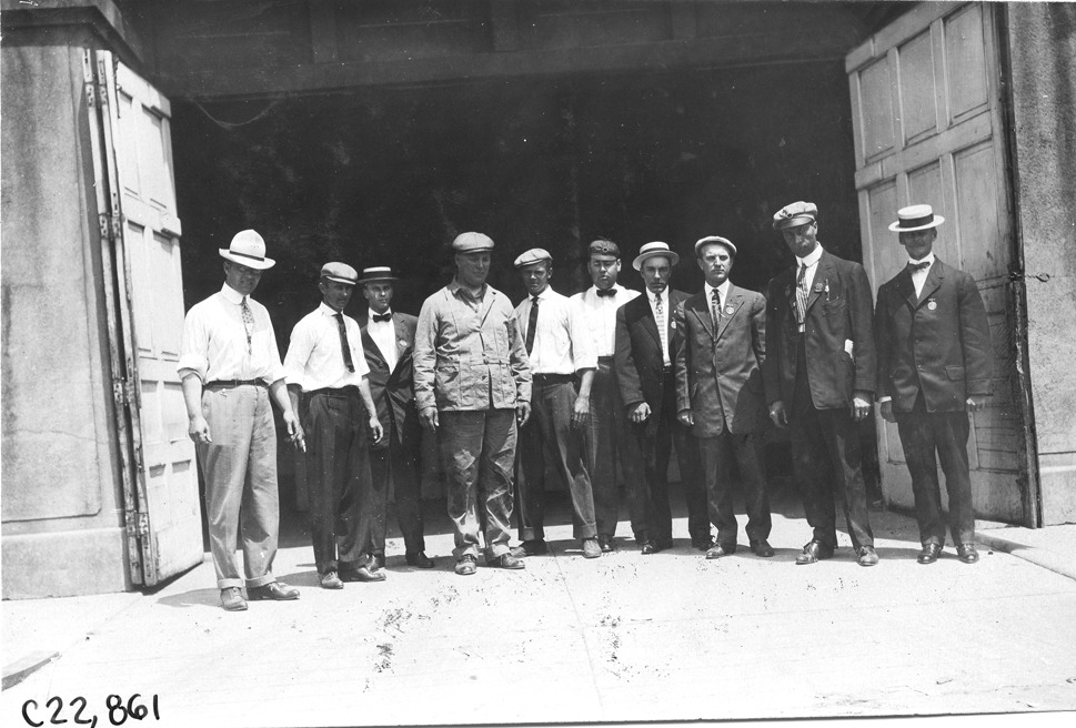 View of the Moline team posed in an open doorway in Kansas City, Missouri, at the 1909 Glidden Tour. Photo edges cut unevenly.