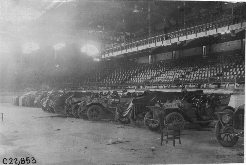 Cars parked inside the convention hall in Kansas City, Missouri, at 1909 Glidden Tour