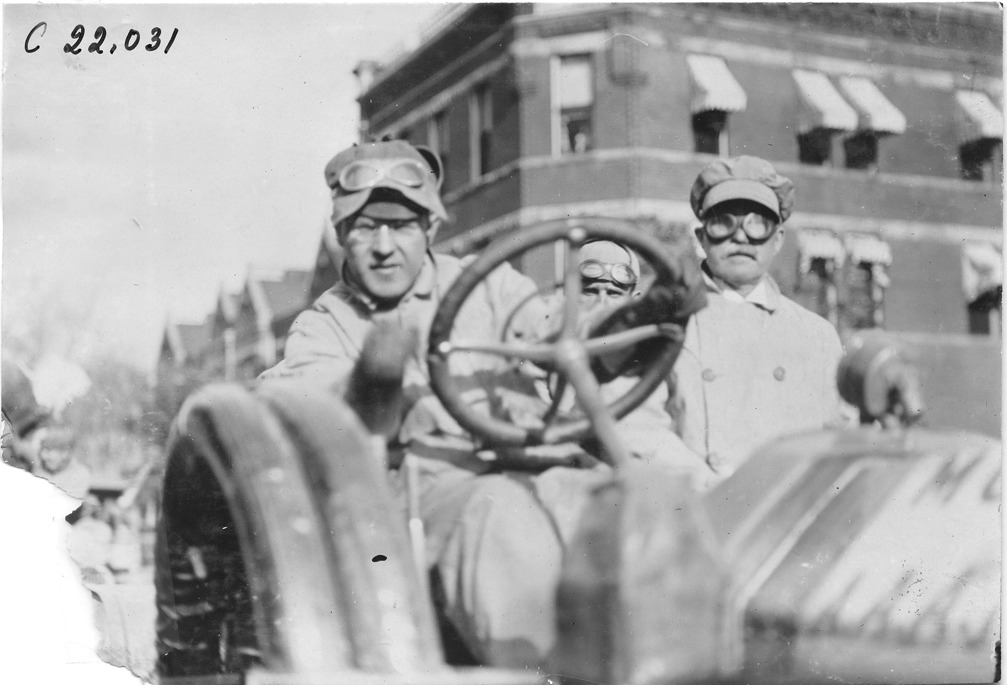 View of C.H. Van Dervoort with two passengers in Moline #102, at 1909 Glidden Tour. Lower left corner of photo is missing. Stamped on back: "Photo by Spooner & Wells, Inc. 1931 Broadway, N.Y."