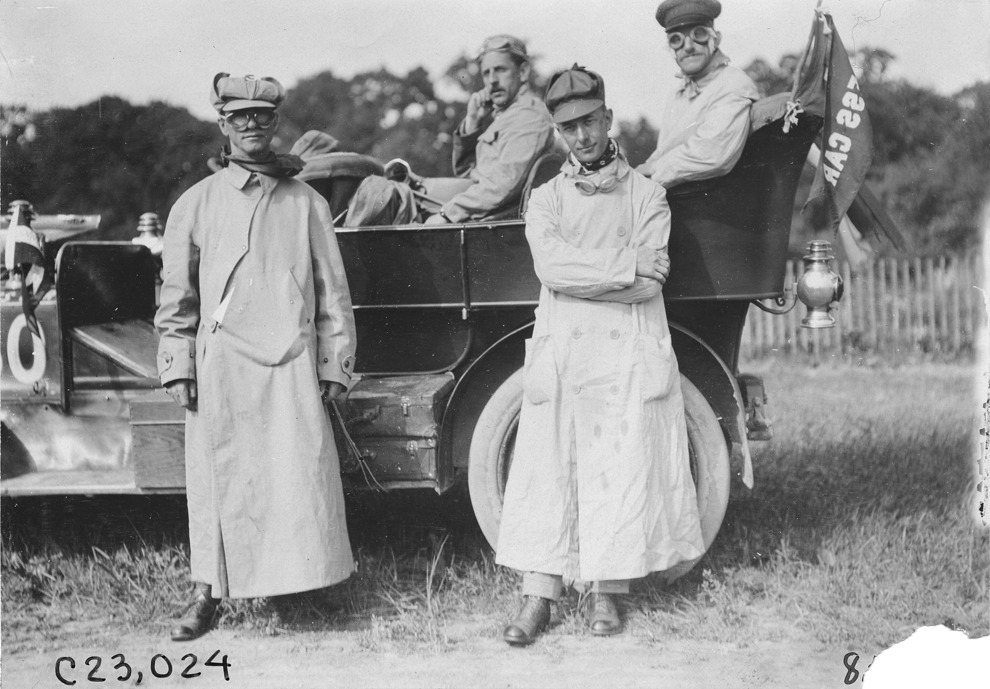 Glidden tourists posed in full length driving coats, hats and goggles, at 1909 Glidden Tour