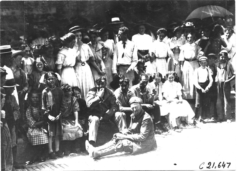 View of unidentified tourists posed with a group of women and children at Wilton, at the 1909 Glidden Tour. Caption on photo back: "Crowd of people at Wilton posed for the tourists for their pictures." Stamped on back: "Photo by Spooner & Wells, Inc. 1931 Broadway, N.Y."