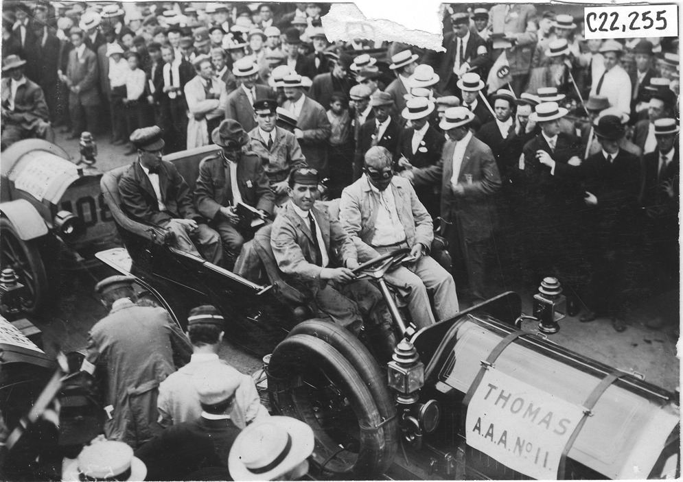 View of Thomas #11 with driver and three passengers, surrounded by crowd of men in hats at reception for tourists in Madison, Wisconsin, at the 1909 Glidden Tour. Top of photo is damaged. Photo edges cut unevenly. Stamped on back: "Spooner & Wells, Inc., photographers, telephones 3472-3473 Columbus, 1931 Broadway, New York."