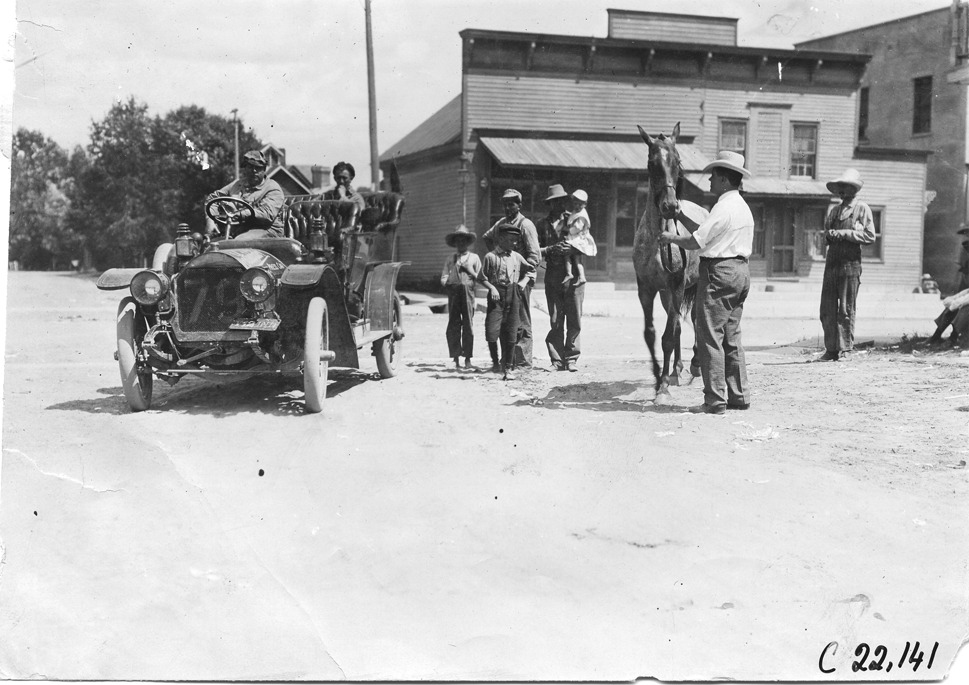 Studebaker car in rural town, at the 1909 Glidden Tour
