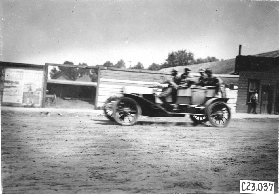 View of driver and three passengers on a dirt road passing wooden fence and building, a man standing on the sidewalk looking on, at the 1909 Glidden Tour. Stamped on back: "Photo by N. Lazarnick, 29 West 42nd Street, N.Y., tel. 594 Bryant."