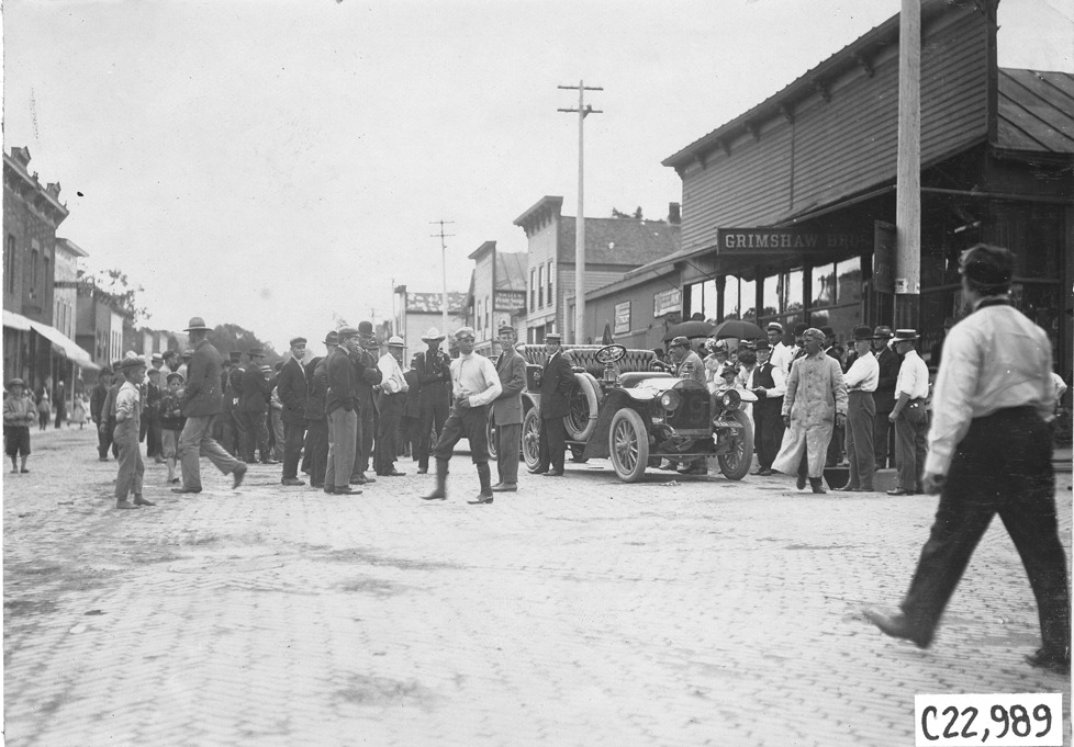 View of Studebaker car #79 on a brick-paved street in front of businesses, surrounded by spectators, at the 1909 Glidden Tour. Stamped on back: "Photo by N. Lazarnick, 29 West 42nd Street, N.Y., tel. 594 Bryant."